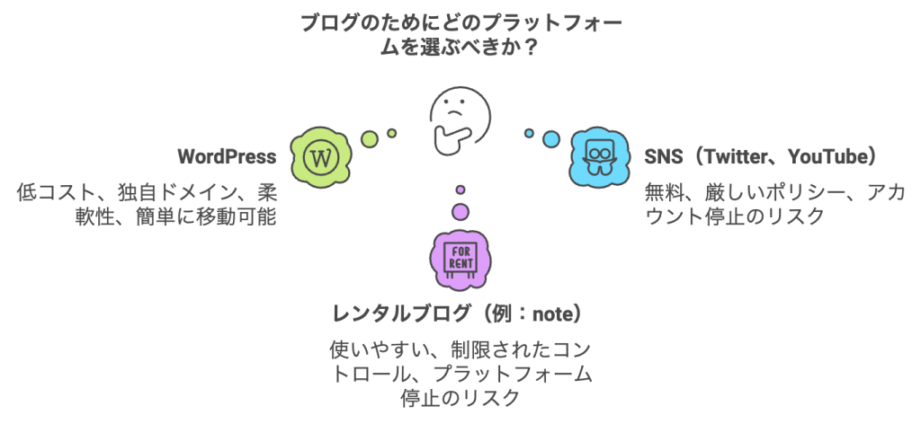 TwitterでもYouTubeでも、プラットフォームの規約変更やBANで、積み上げた資産を一瞬で失うリスクがあります。noteのようなレンタルブログも、サービス終了のリスクはゼロではありません。