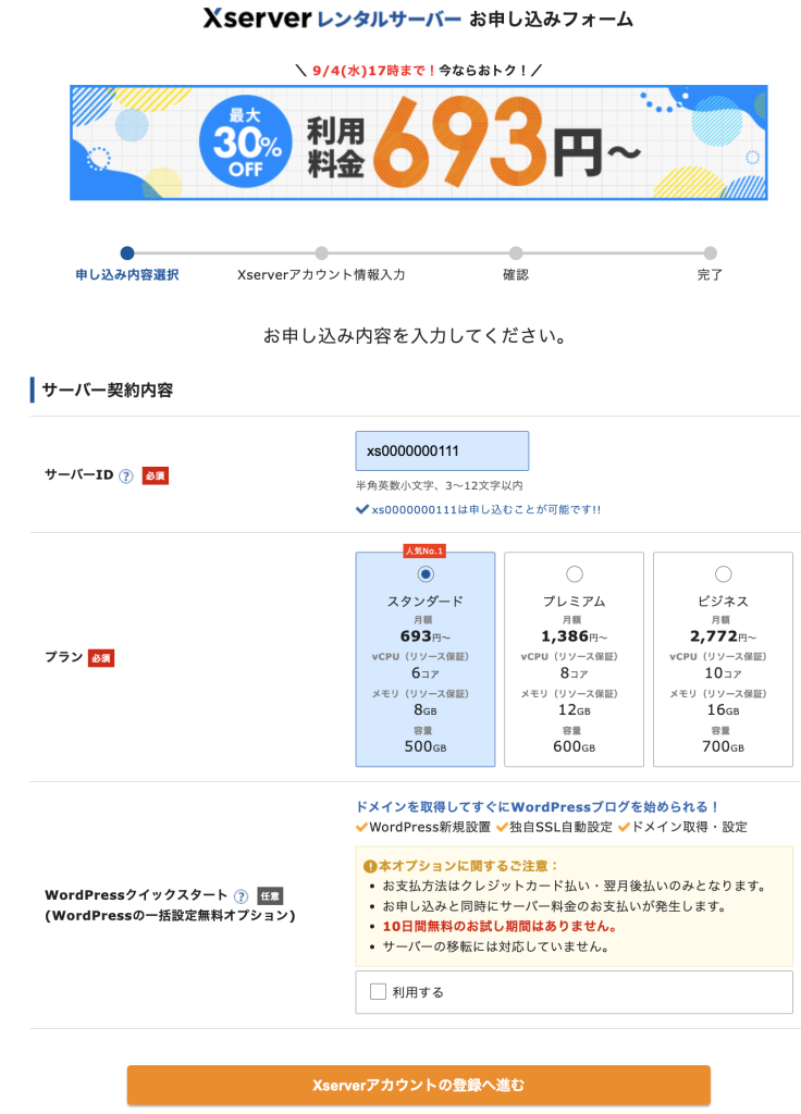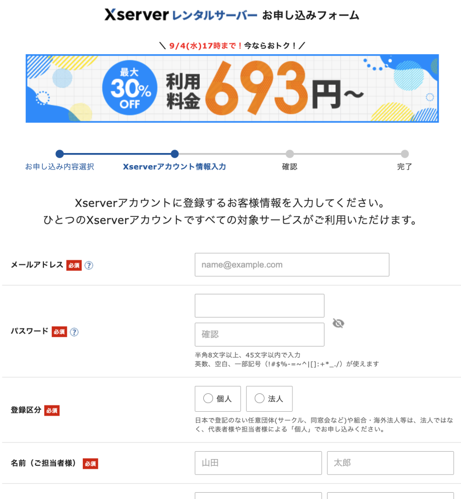 エックスサーバーの申込画面から進めます。パソコンでの操作を推奨します。
