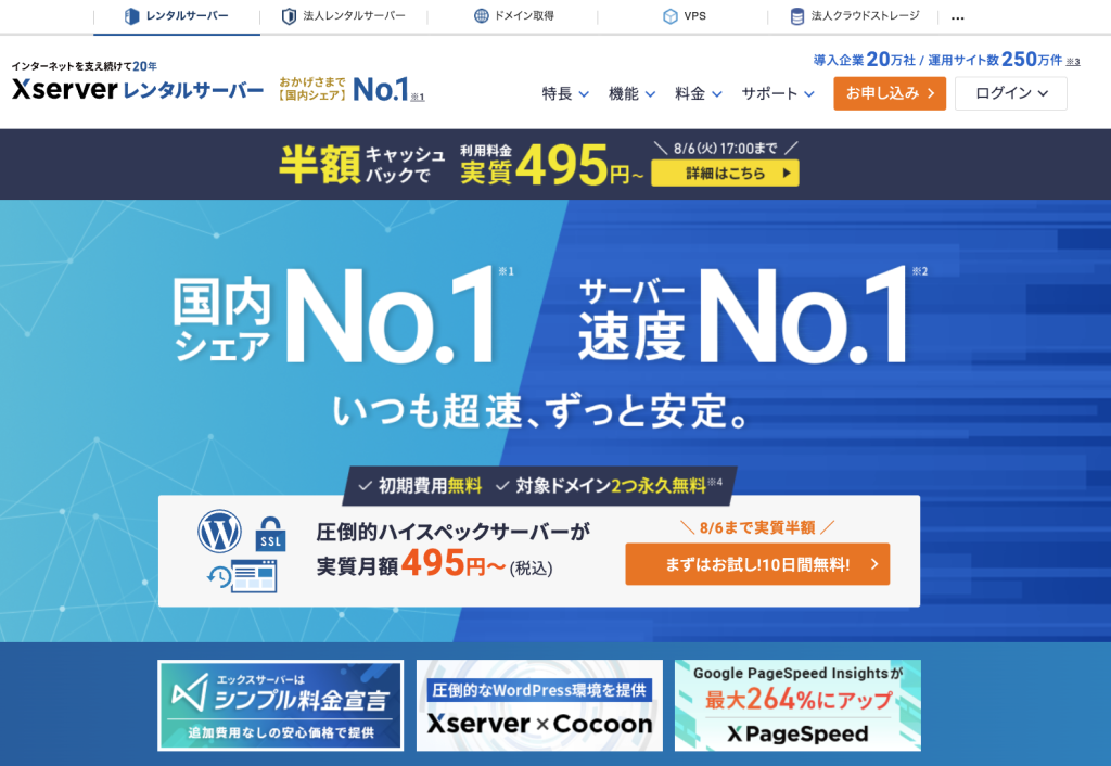 GMOペパボ提供。月額250円からのリーズナブルな料金プランが特徴。WordPress簡単インストール、無料SSL、メール・チャットサポート完備。「とにかく安く始めたい」方向け。