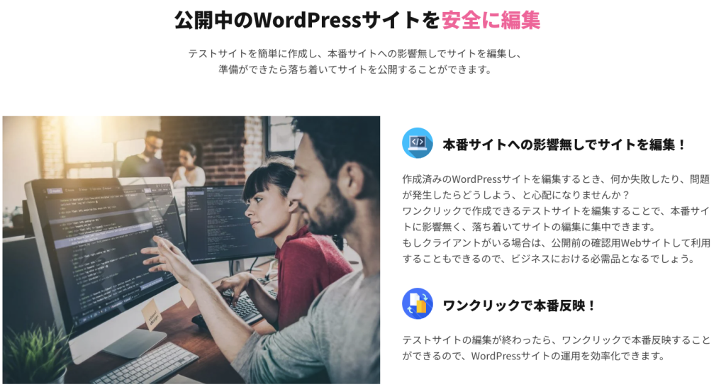 NVMe SSD + LiteSpeed採用で高速。WordPress簡単インストール、自動バックアップ、スケールアップ機能、本番影響なしのサイト編集機能も備えています。